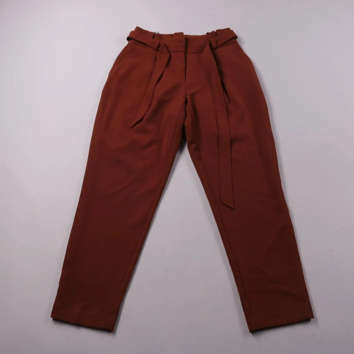 Брюки New Look в терракотово-коричневом оттенке, с завышенной талией, складками спереди и поясом-лентой. Подойдут для офиса и повседневных образов с блузками и жакетами. Ткань с добавлением эластана даёт небольшую эластичность и комфорт при посадке.