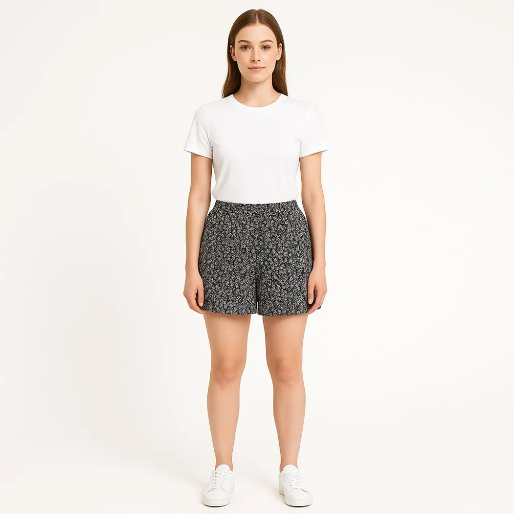 Женские шорты Amisu с чёрно-белым цветочным принтом и эластичным поясом. Подойдут для летних прогулок и повседневных образов с футболкой или топом. Лёгкая посадка на резинке делает их удобными в носке.