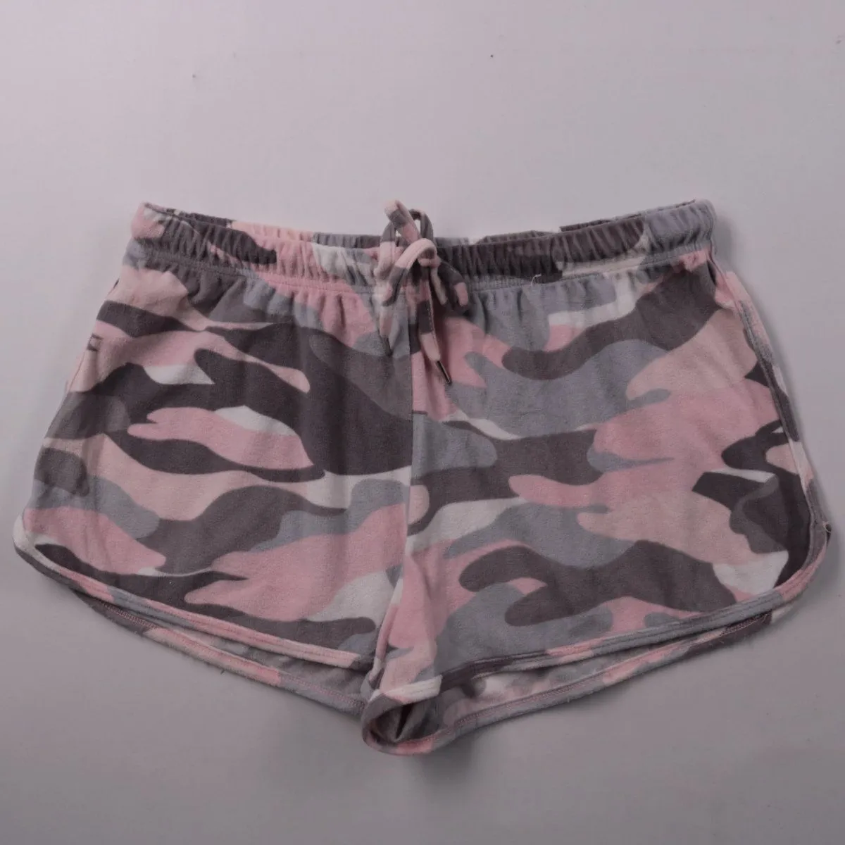 Женские шорты Primark Cares с камуфляжным принтом в розово-серых тонах и кулиской на поясе. Подойдут для дома, сна или отдыха в тёплую погоду. Лёгкий полиэстер быстро сохнет и прост в уходе.