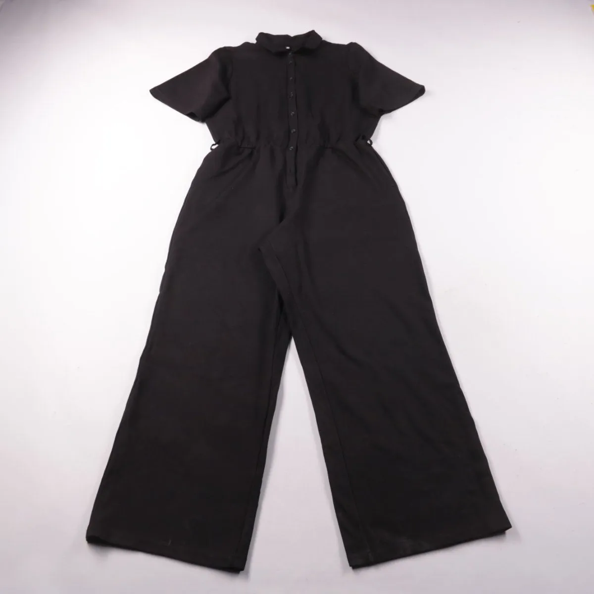 Женский чёрный комбинезон HEMA с коротким рукавом и застёжкой на пуговицы спереди. Приталивание за счёт резинки на талии, брючины широкие — подойдёт для повседневных образов и поездок. Ткань с добавлением эластана, поэтому немного тянется и удобна в движении.