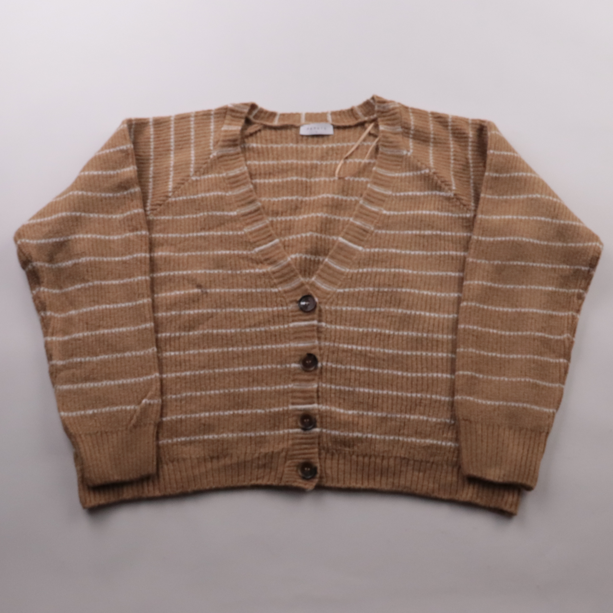 Кардиган Papaya в бежевом цвете с тонкой белой полоской и V-образным вырезом на пуговицах. Подойдёт для повседневных образов и офиса — удобно носить поверх топа или рубашки. Мягкий трикотаж с добавлением эластана хорошо тянется и комфортно садится по ф...