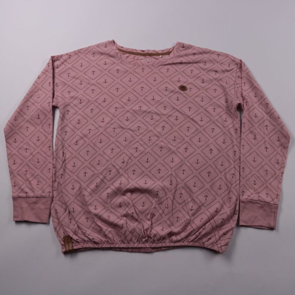 Женский джемпер Gina розового цвета с принтом в виде якорей и круглым вырезом. Подойдёт для повседневных образов на прогулку или в офис в прохладную погоду. Трикотаж с добавлением полиэстера меньше мнётся и проще в уходе.