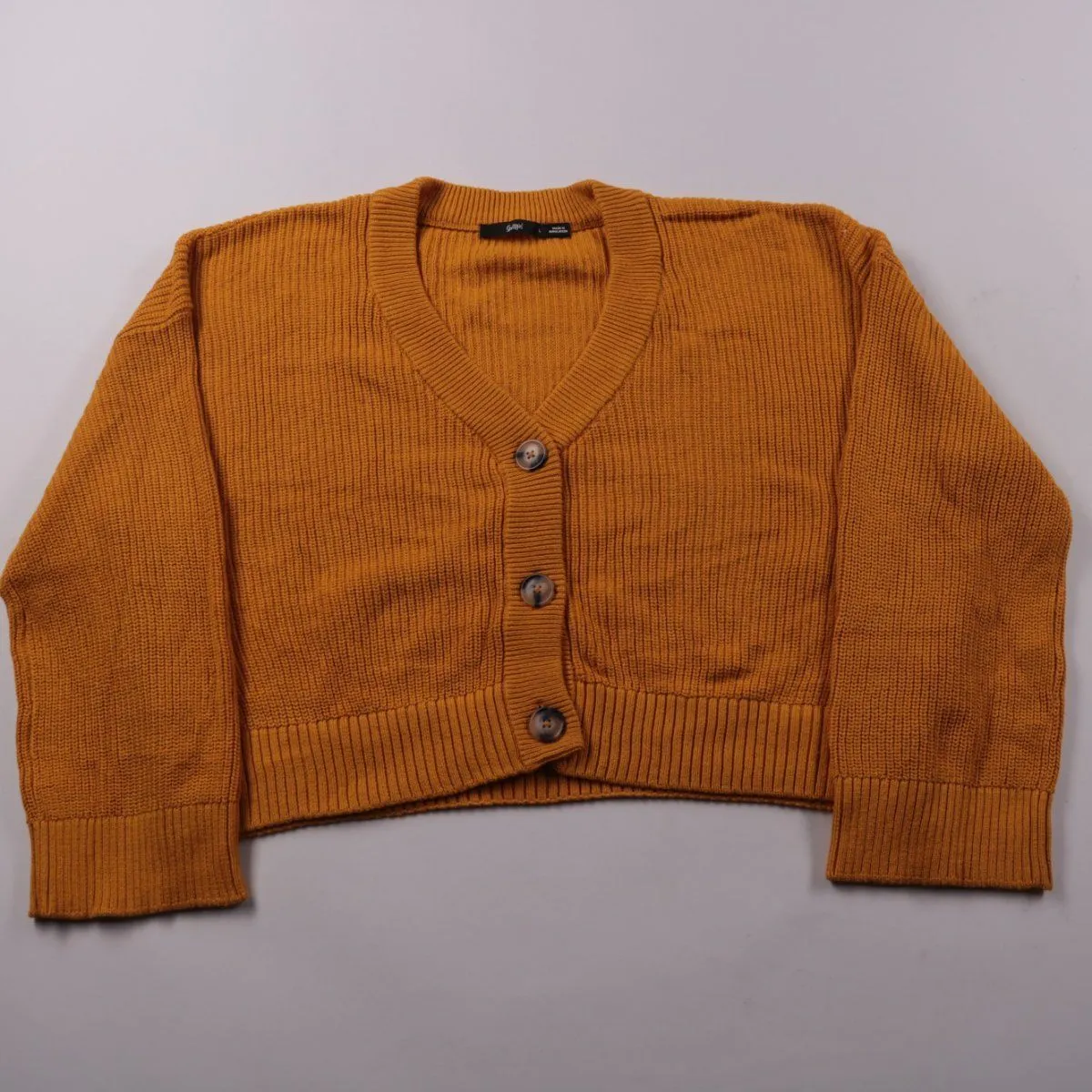 Укороченный вязаный кардиган Sportsgirl горчично-оранжевого цвета на пуговицах и с V-образным вырезом. Подойдёт для повседневных образов и накидывания поверх топа или платья в прохладные дни. Натуральный хлопок приятен к телу и хорошо пропускает воздух.