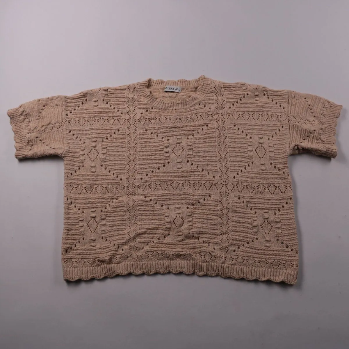 Вязаный джемпер Gallery бежевого оттенка Stone с коротким рукавом и ажурным узором. Подойдёт для повседневных летних образов и для тёплой весны/осени в слоистых сочетаниях. Натуральный хлопок хорошо пропускает воздух и комфортен в носке.