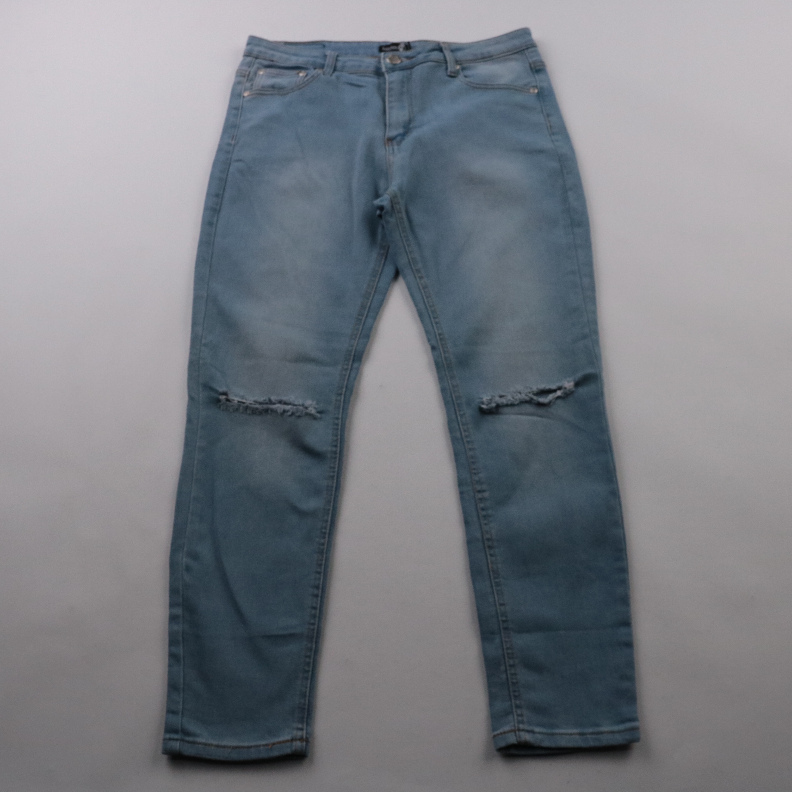 Женские джинсы Boohoo в светло-голубом дениме с декоративными разрезами на коленях. Подойдут для повседневных образов с кедами или ботинками в любое время года. Ткань с добавлением эластана даёт более комфортную посадку и свободу движений.
