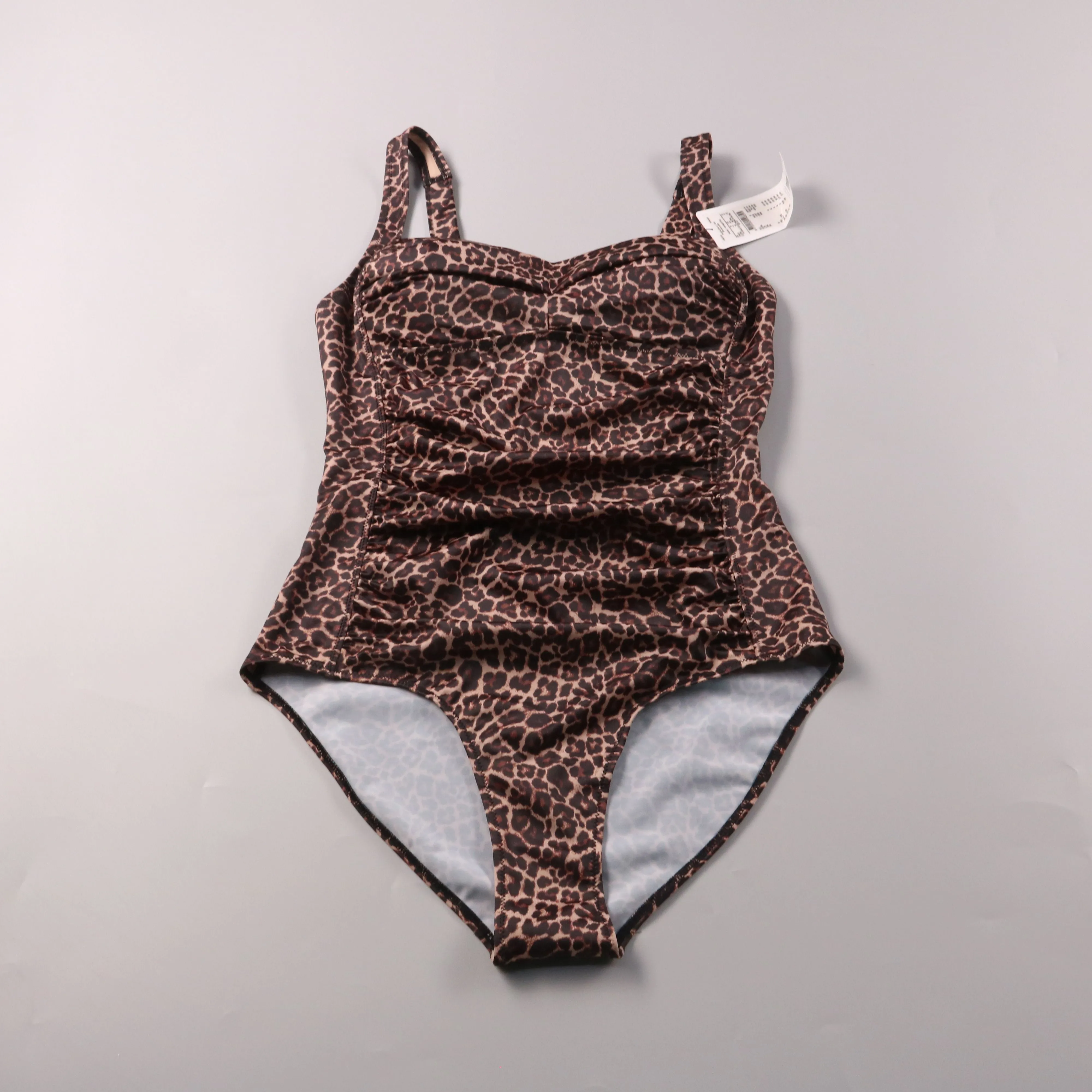 Слитный купальник с леопардовым принтом, без бренда на бирке, на тонких бретелях и с драпировкой по переду. Подойдёт для пляжа и бассейна, ткань эластичная и хорошо облегает. Есть подкладка, поэтому купальник меньше просвечивает в воде.