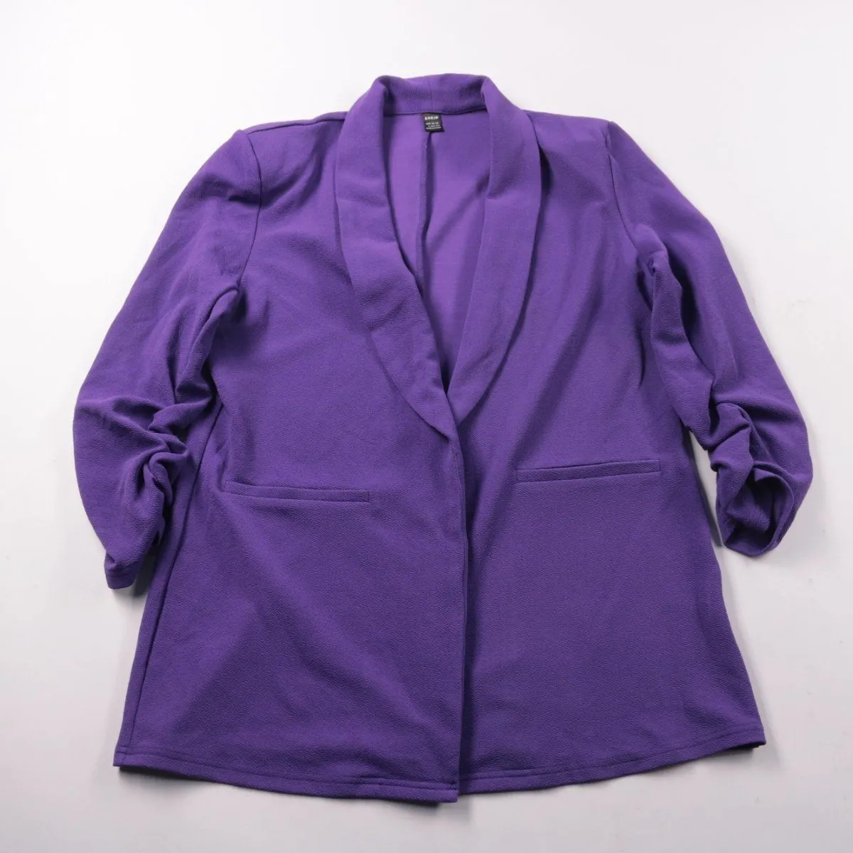 Женский пиджак Shein фиолетового цвета, удлинённый, без застёжки, с шалевым воротником и накладными карманами. Подойдёт для офиса и повседневных образов, удобно носить как лёгкий верхний слой в прохладную погоду. Практичный плюс — мягкая ткань с небольшим добавлением эластана лучше держит посадку и не стесняет движения.