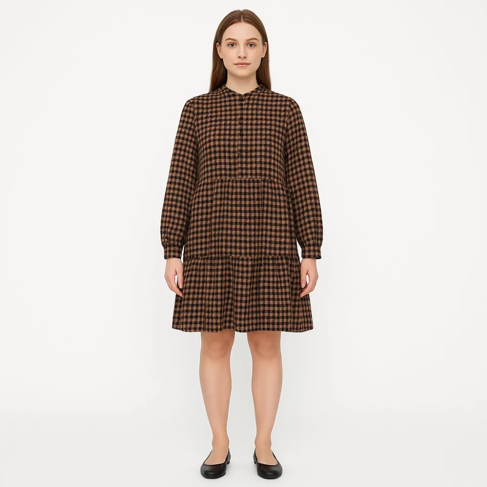 Повседневное платье Mango в коричнево-чёрную клетку, свободного кроя с длинным рукавом и планкой на пуговицах. Подойдёт для офиса и прогулок в прохладную погоду, легко сочетается с ботинками и лоферами. Практичная ткань и немаркий принт делают его удоб...