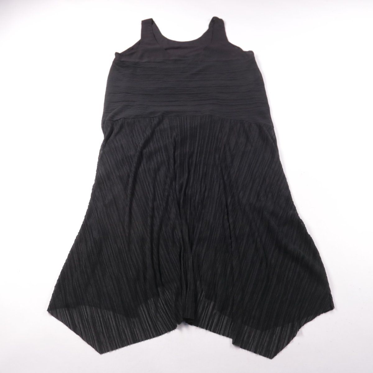Чёрное повседневное платье Sussan без рукавов с фактурной/плиссированной юбкой и асимметричным низом. Подойдёт для лета и тёплой погоды, можно носить с сандалиями или кедами. Лёгкая ткань из полиэстера проста в уходе и почти не мнётся.