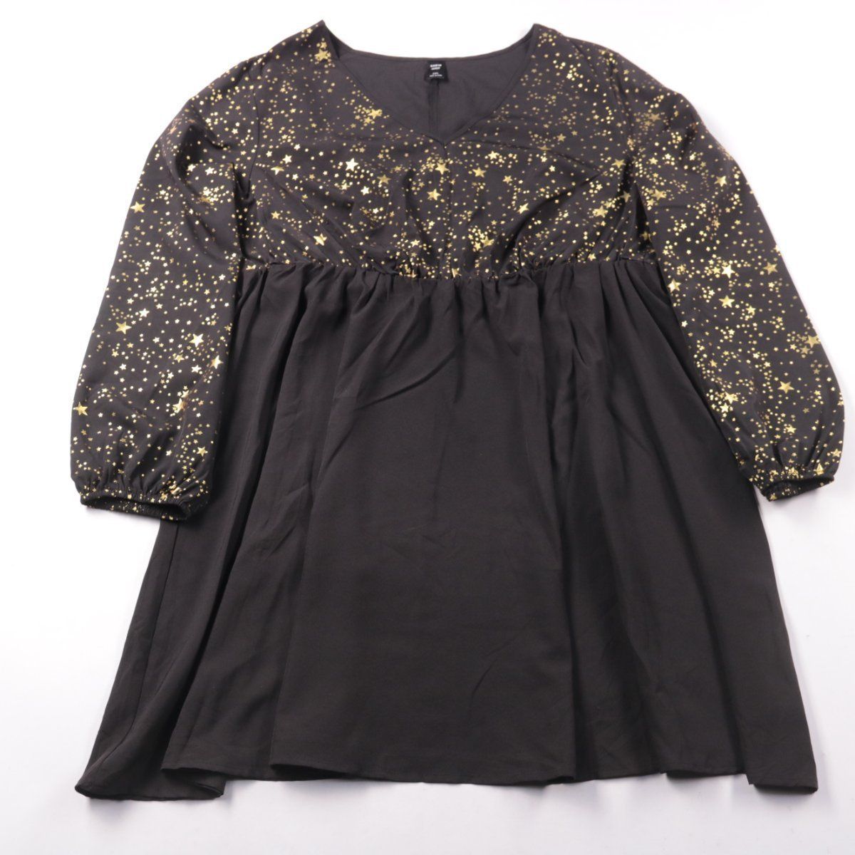 Повседневное платье SHEIN Curve чёрного цвета с принтом в золотые звёзды, V-образным вырезом и завышенной линией талии на сборке. Подойдёт для прогулок и повседневных выходов в прохладную погоду благодаря длинным рукавам на манжетах. Лёгкая ткань почти не мнётся и удобна в уходе.