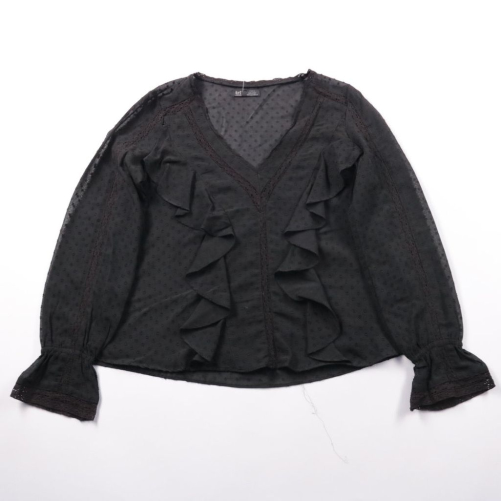 Женская блузка Zara TRF из полупрозрачного шифона с фактурой в горошек и V-вырезом, декорирована рюшами спереди. Подойдёт для офиса и выходов, красиво смотрится с юбкой или брюками с высокой посадкой. Лёгкая ткань быстро сохнет и почти не занимает мест...