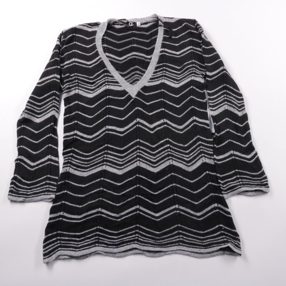 Вязаная туника Q7 с V-образным вырезом и рукавом 3/4, выполнена в чёрном цвете с серебристыми зигзагообразными полосами. Подойдёт для повседневных образов и офиса в прохладную погоду, хорошо смотрится с джинсами и брюками. Материал мягкий и эластичный,...