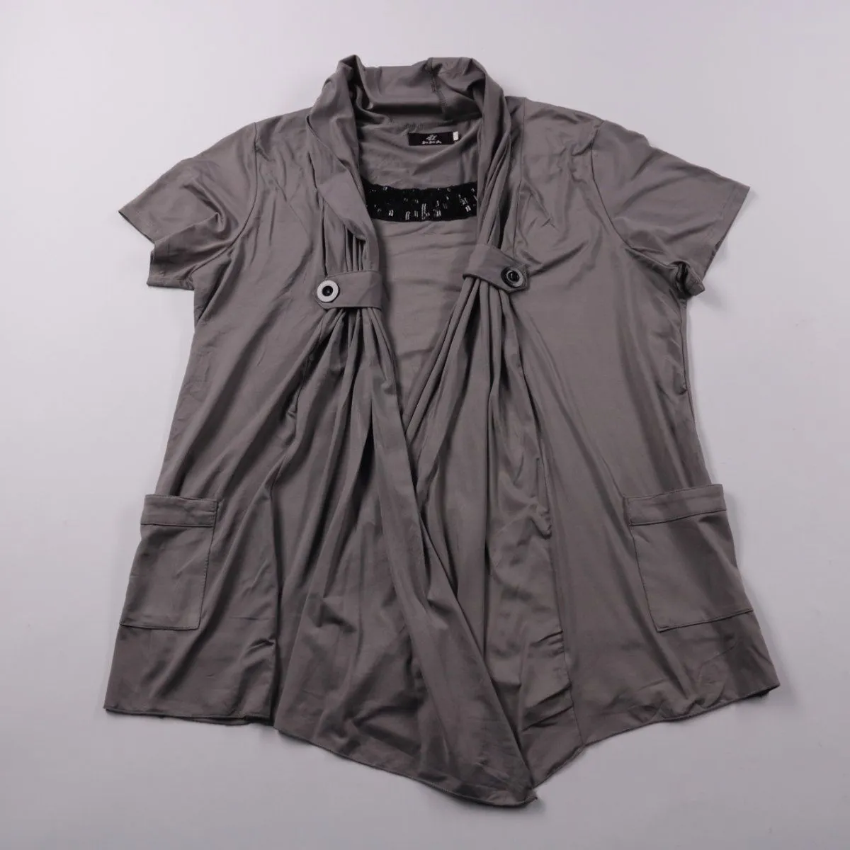 Женская блузка свободного кроя с коротким рукавом и драпировкой спереди на пуговицах. Подойдёт для повседневных образов и офиса, легко сочетается с брюками и джинсами. Практичный плюс — мягкая струящаяся ткань и накладные карманы.