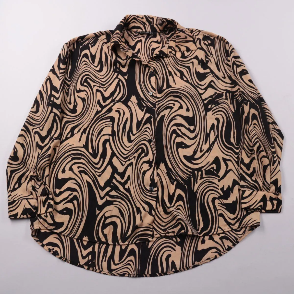 Блузка Stradivarius с длинным рукавом и абстрактным принтом в бежево-чёрной гамме. Подойдёт для повседневных образов и офиса в сочетании с однотонными брюками или джинсами. Лёгкий полиэстер почти не мнётся и быстро сохнет.
