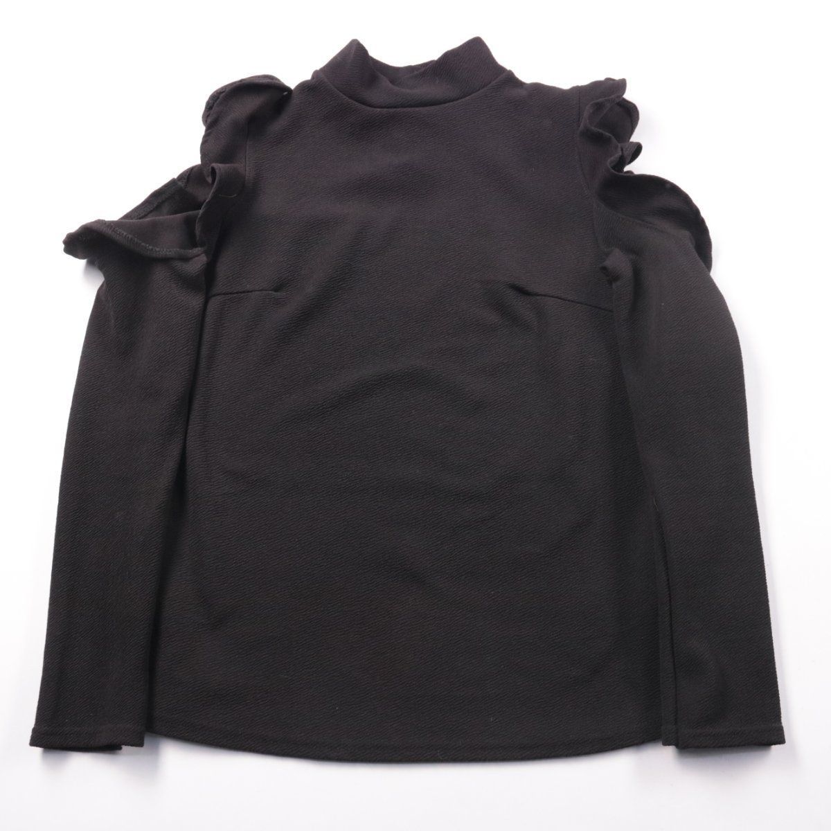 Чёрная блузка Peacocks с воротником-стойкой и длинными рукавами с воланами на плечах. Подойдёт для офиса, учёбы и вечерних образов с юбкой или брюками. Практичный материал почти не мнётся и хорошо тянется за счёт эластана.
