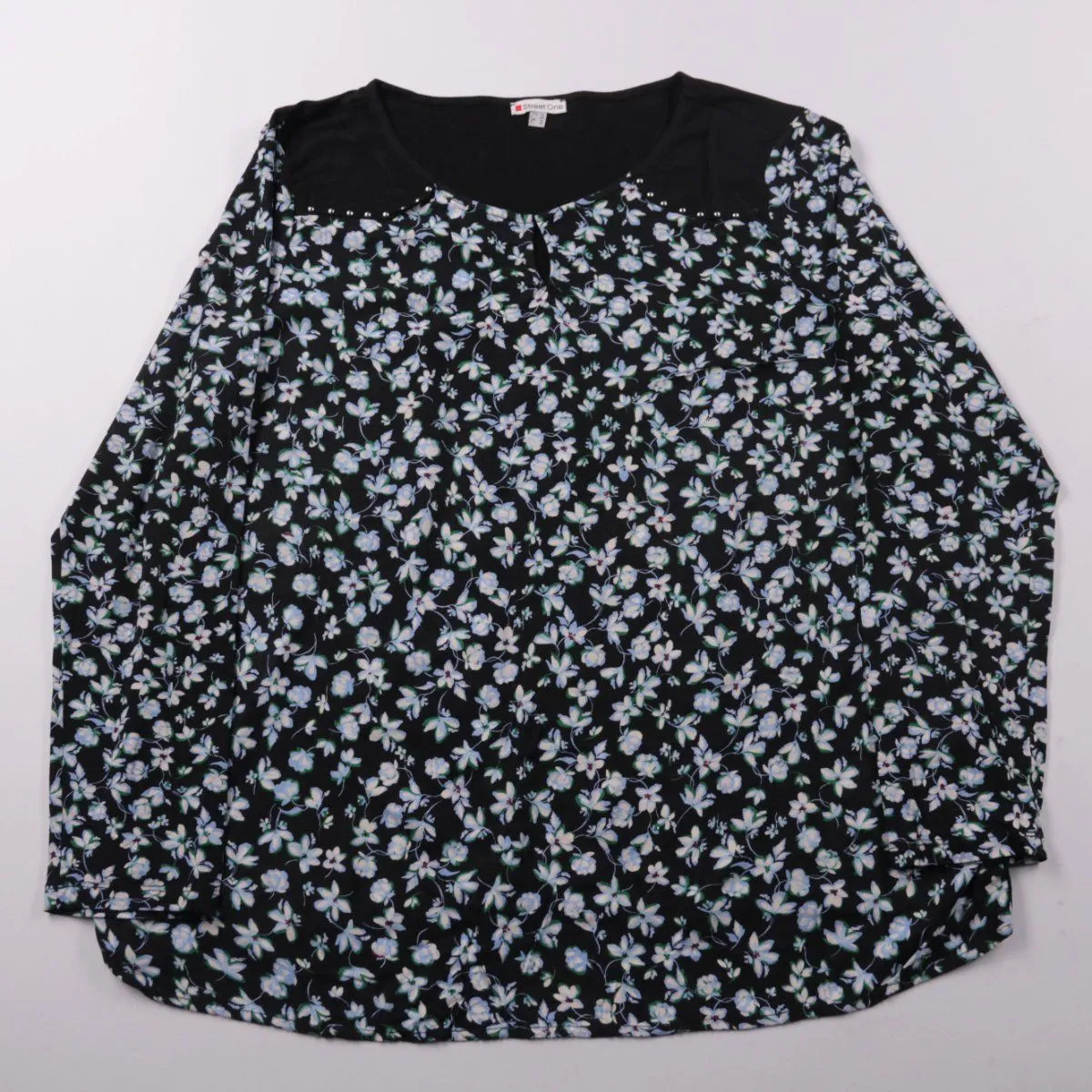 Женская блузка Street One с длинным рукавом и цветочным принтом на чёрном фоне, с однотонной вставкой у горловины. Подойдёт для офиса и повседневных образов с джинсами или юбкой. Лёгкая ткань комфортно носится и не сковывает движения.