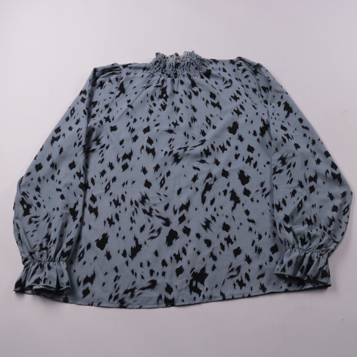 Женская блузка с высоким присборенным воротником и длинным рукавом на манжете, с чёрным принтом на голубовато-сером фоне. Подойдёт для повседневных образов и офиса с брюками или юбкой. Ткань из полиэстера практически не мнётся и быстро сохнет после стирки.