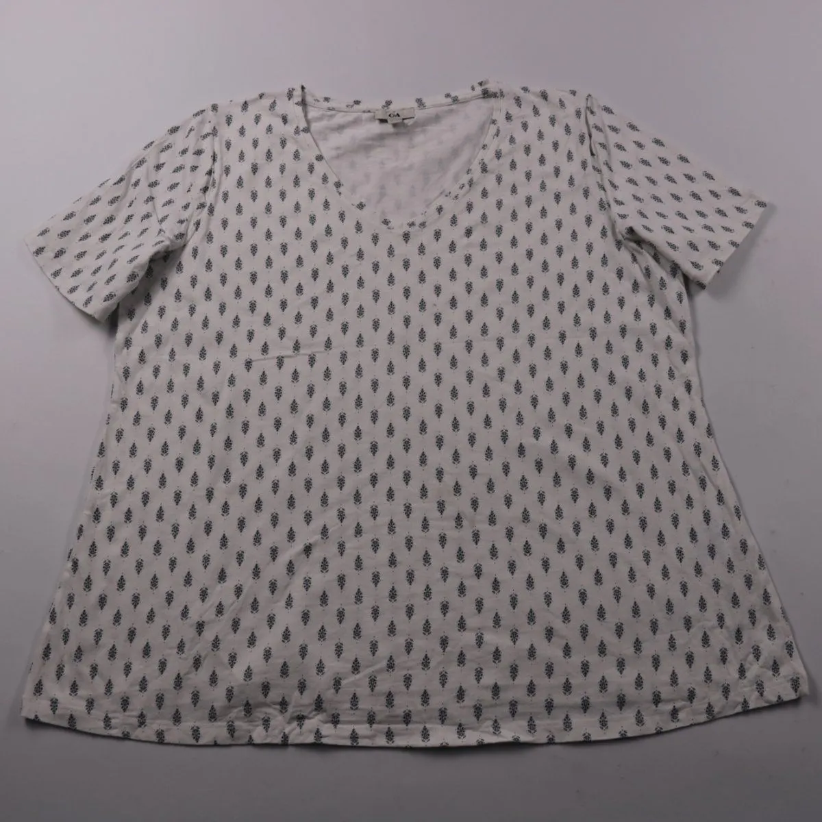 Женская футболка C&A белого цвета с мелким принтом и V‑образным вырезом. Подойдёт для повседневных образов и на лето, и как базовый слой под кардиган/пиджак. Хлопковая ткань с добавлением эластана хорошо тянется и комфортно сидит.