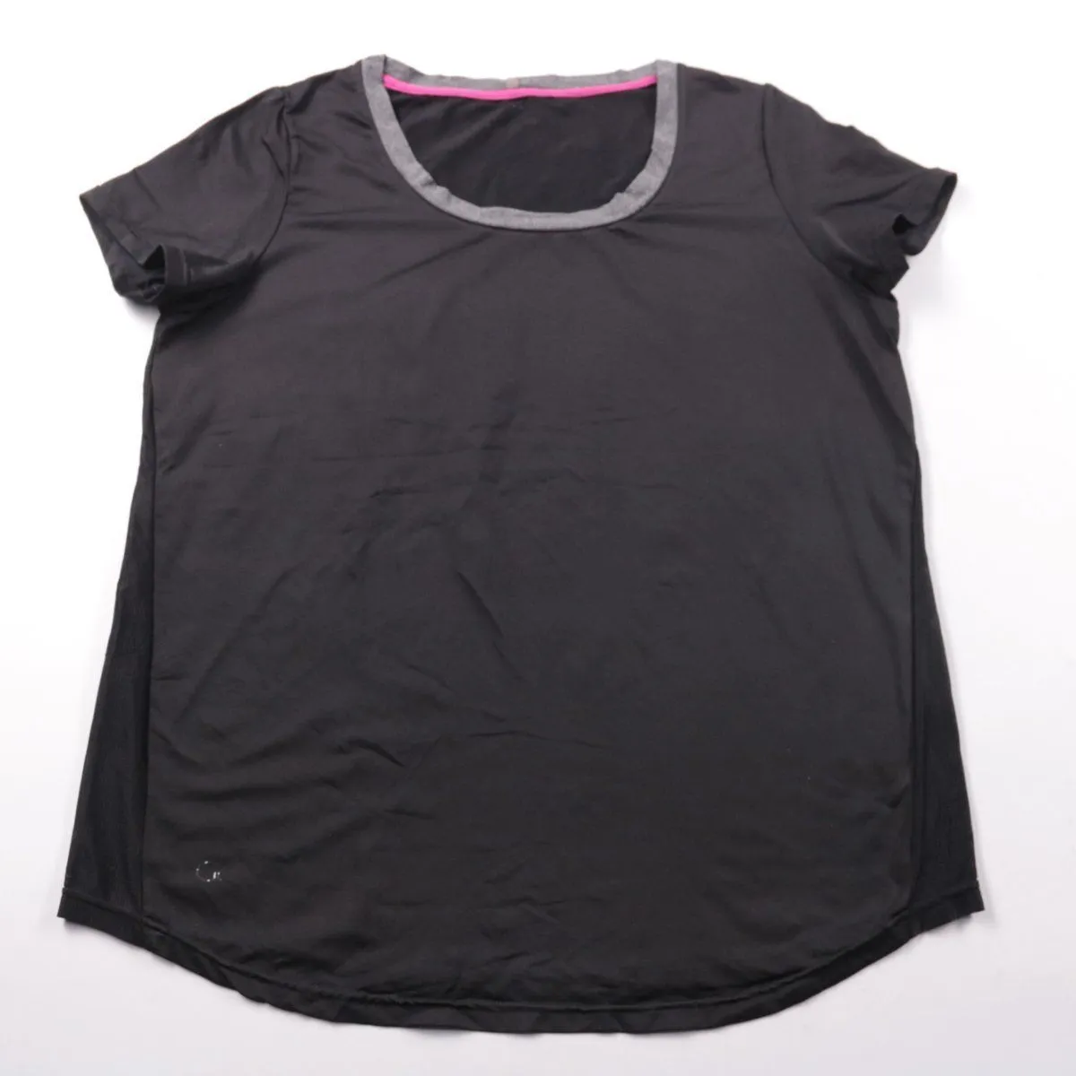 Женская чёрная футболка с коротким рукавом и округлым вырезом с серой окантовкой. Подойдёт для повседневной носки и как базовый слой под кардиган или жакет. Практична тем, что легко сочетается с любыми цветами и не требует сложного ухода.
