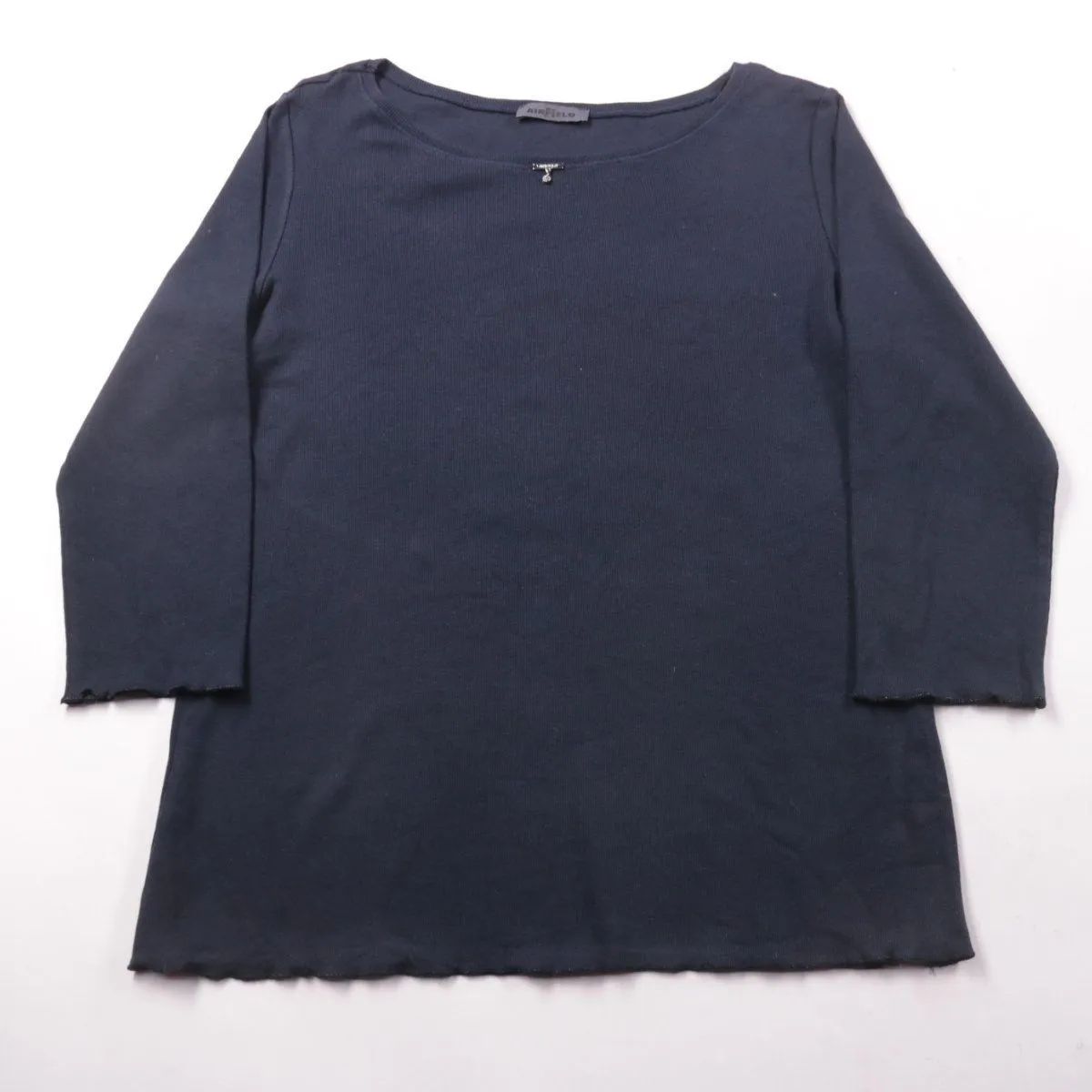 Женский лонгслив Airfield тёмно-синего цвета с рукавом 3/4 и округлым вырезом. Подойдёт для повседневных образов и офиса в сочетании с брюками или юбкой. Трикотаж с добавлением эластана комфортно тянется и не сковывает движения.