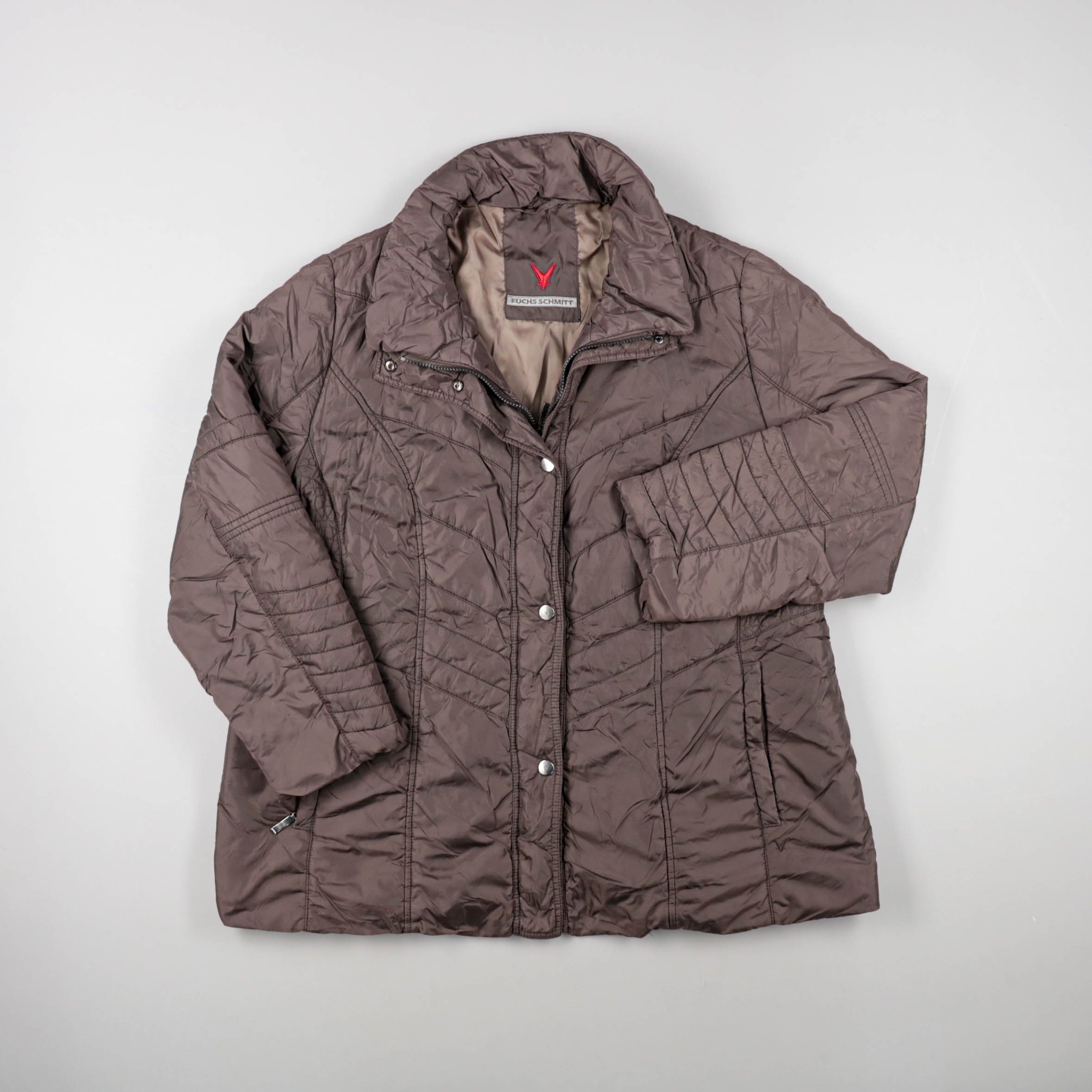 Женская стёганая куртка Fuchs Schmitt в коричневом цвете с высоким воротником и застёжкой на молнию и кнопки. Подойдёт для прохладной осени и весны, удобно смотрится с джинсами и повседневной обувью. Практичный плюс — карманы на молнии и лёгкий утеплён...