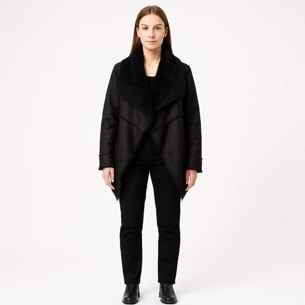 Женская дублёнка из искусственной замши с мягкой меховой отделкой, цвет чёрный. Подойдёт для прохладной осени и тёплой зимы, хорошо сочетается с повседневными образами. Практичный материал из полиэстера легко чистится и быстро сохнет.