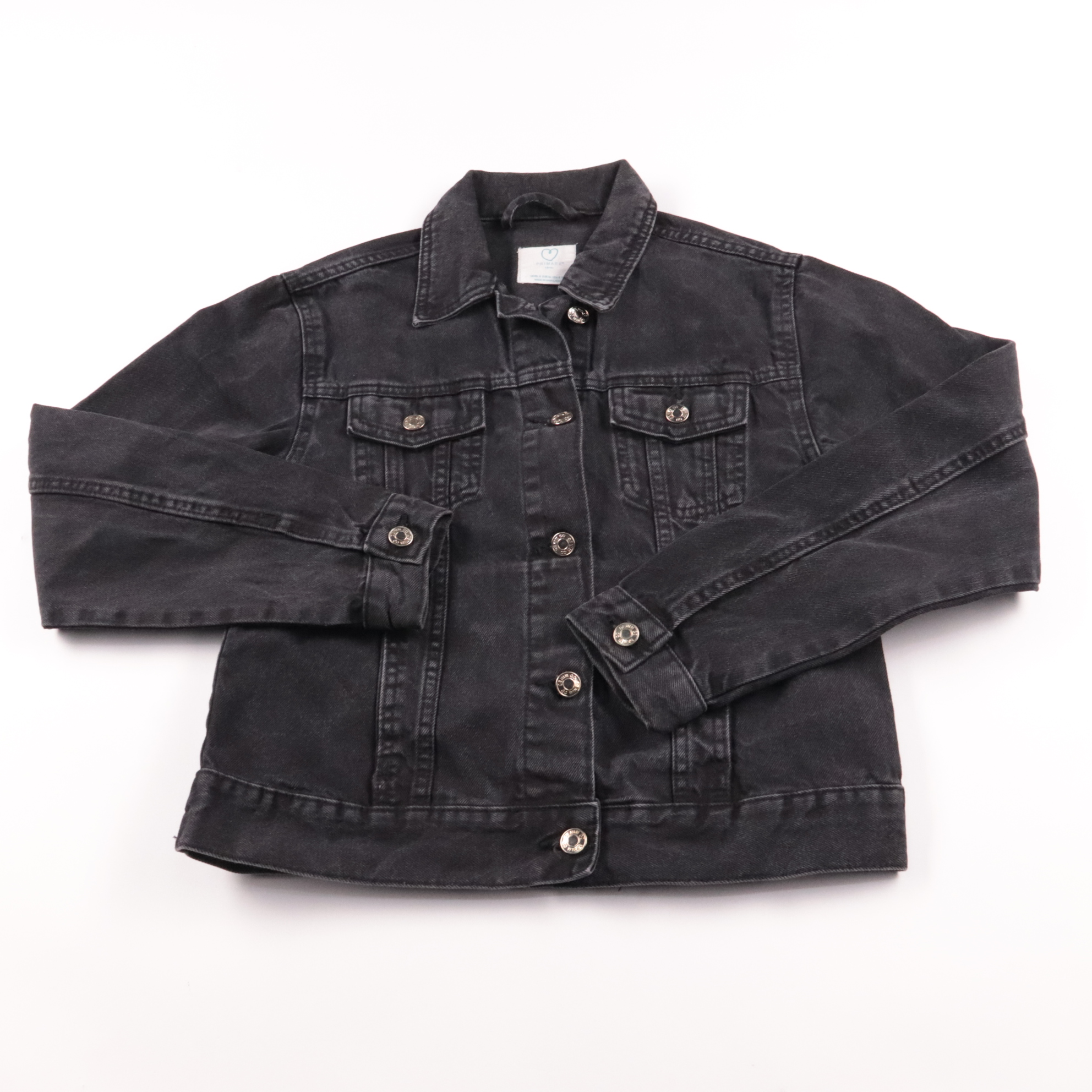 Джинсовая куртка Primark в выцветшем чёрном цвете, классический прямой крой с отложным воротником и нагрудными карманами. Подойдёт для прохладной погоды весной и осенью, легко сочетается с джинсами, платьями и кроссовками. Плотный хлопковый деним хорош...