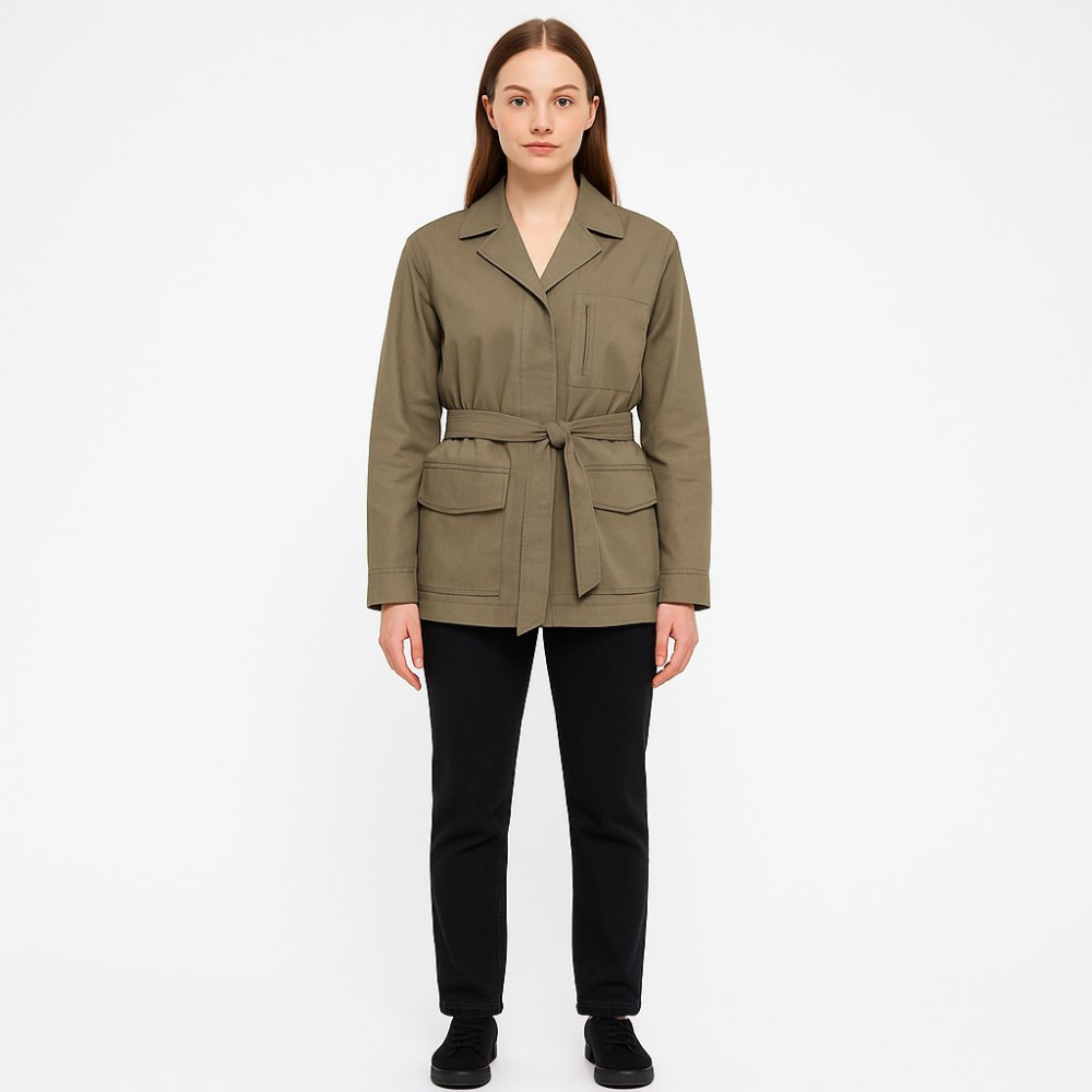 Лёгкая куртка Remain в оттенке хаки с отложным воротником и поясом на талии. Подойдёт для повседневных образов в демисезон и для прохладных летних вечеров, удобно комбинируется с джинсами и брюками. Практичные накладные карманы и плотная ткань хорошо д...