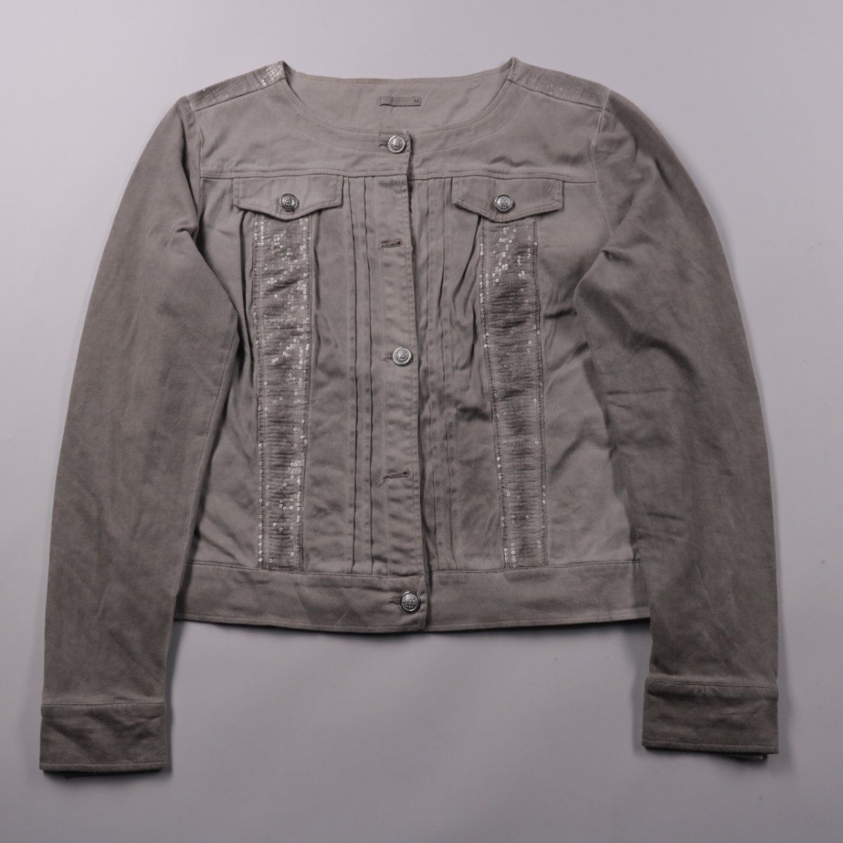 Лёгкая женская куртка Bonita серого цвета с круглыm вырезом и застёжкой на пуговицы, декорирована вставками с пайетками спереди. Подойдёт для прохладной весны/осени и для повседневных образов с джинсами или юбкой. Хлопковая ткань со стрейчем комфортно сидит и не сковывает движения.