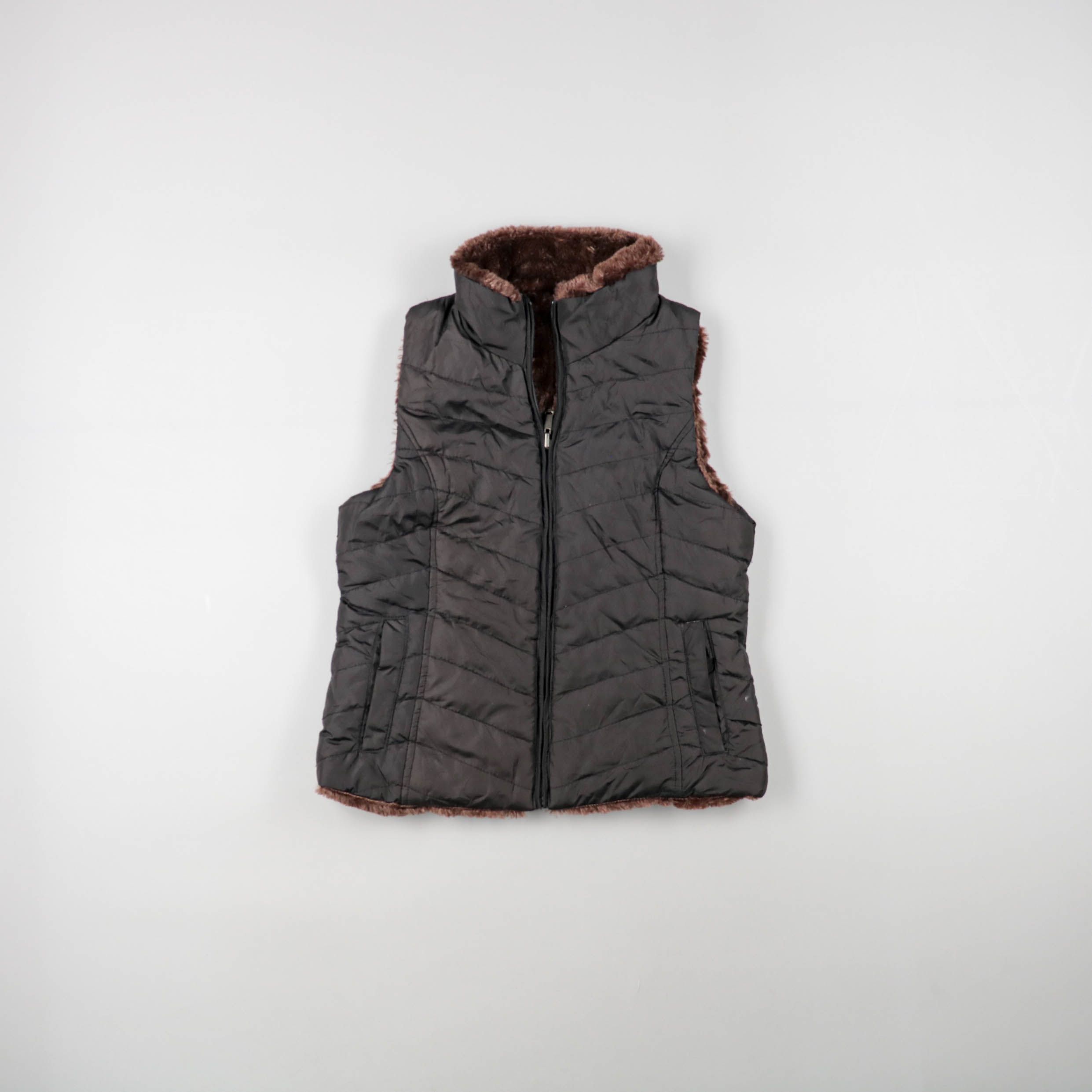 Стёганый жилет без бренда, чёрного цвета с тёплой коричневой меховой подкладкой и высоким воротником. Подойдёт для прохладной осени или весны, удобно носить поверх худи или свитера. Практичные карманы и застёжка-молния помогают держать руки в тепле и б...
