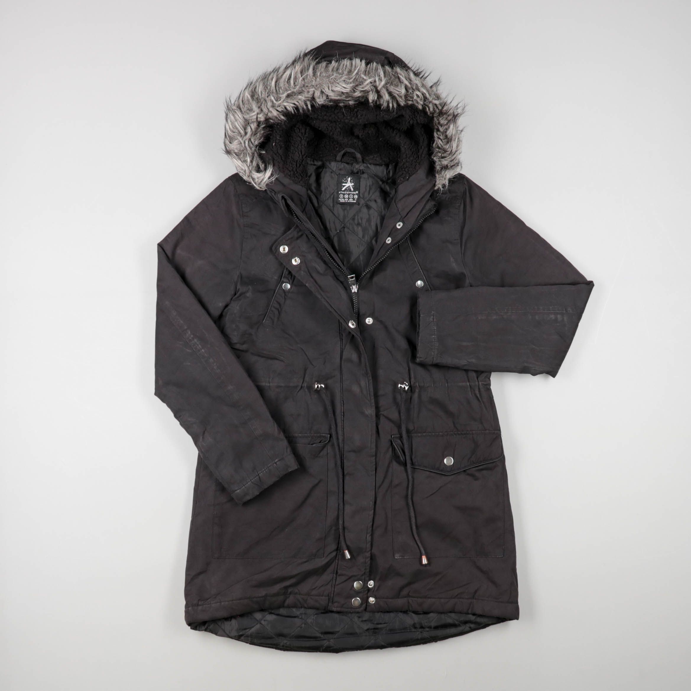 Женская зимняя куртка Atmosphere чёрного цвета с капюшоном и опушкой из искусственного меха. Подойдёт для повседневных прогулок и поездок в холодную погоду, посадку можно регулировать кулиской на талии. Практичный плюс — застёжка на молнию и кнопки и в...