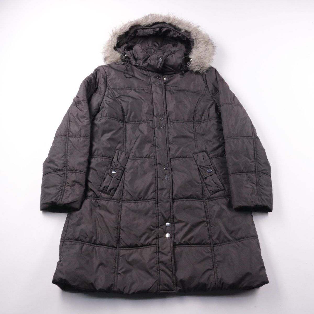 Женский пуховик Adagio тёмного цвета с капюшоном и меховой опушкой, стёганый и удлинённый. Подойдёт для зимних прогулок и повседневной носки в холодную погоду. Практичная застёжка на молнию и кнопки помогает лучше удерживать тепло.