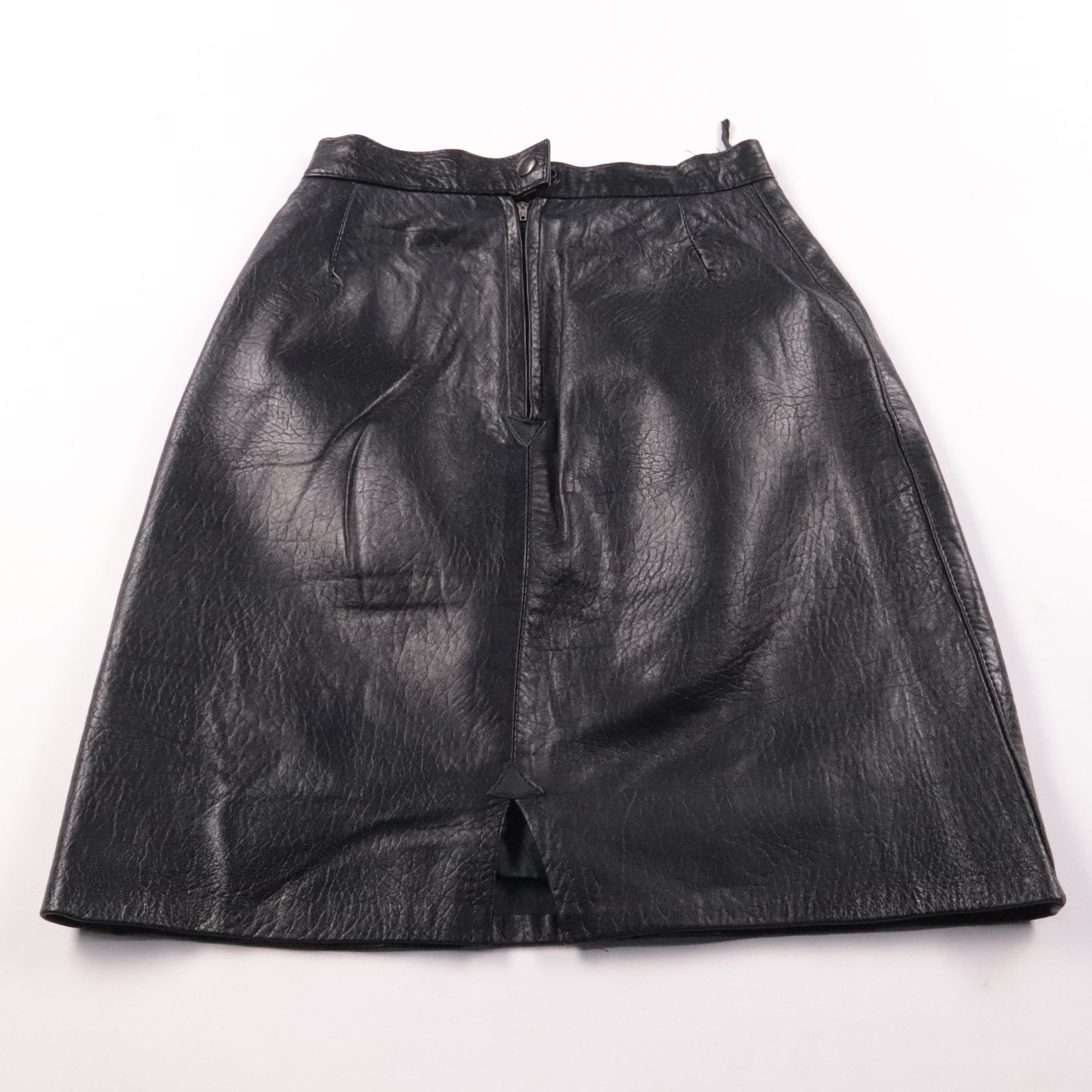 Чёрная кожаная юбка с молнией спереди и небольшим разрезом снизу. Подойдёт для повседневных образов и вечера, легко сочетается с базовыми топами и жакетами. Практичный материал, который хорошо держит форму и долго носится.
