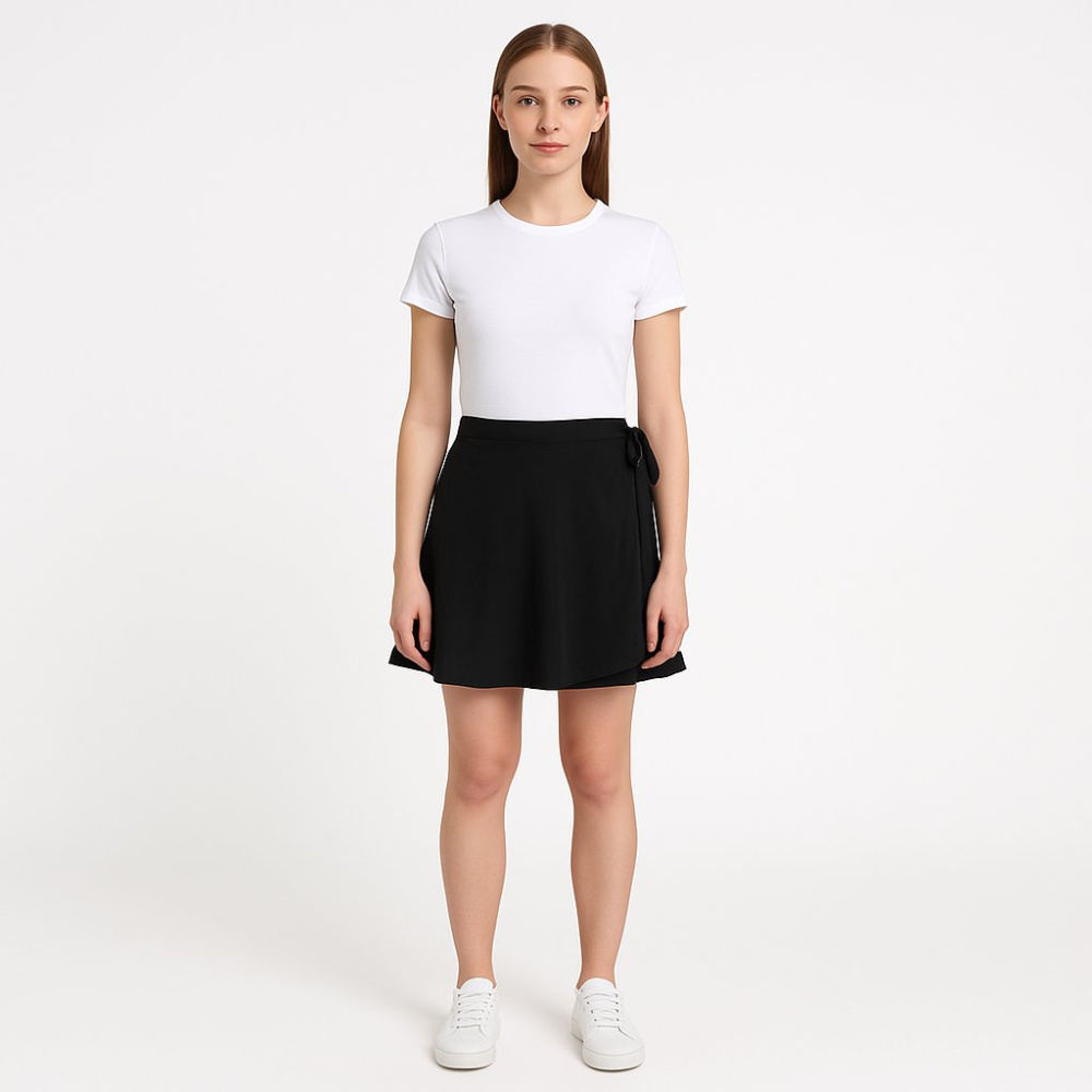 Юбка Shein Curve чёрного цвета с запахом и завязкой сбоку. Подойдёт для повседневных образов и офиса в сочетании с футболкой или блузой. Лёгкая ткань и удобная посадка на талии не сковывают движения.