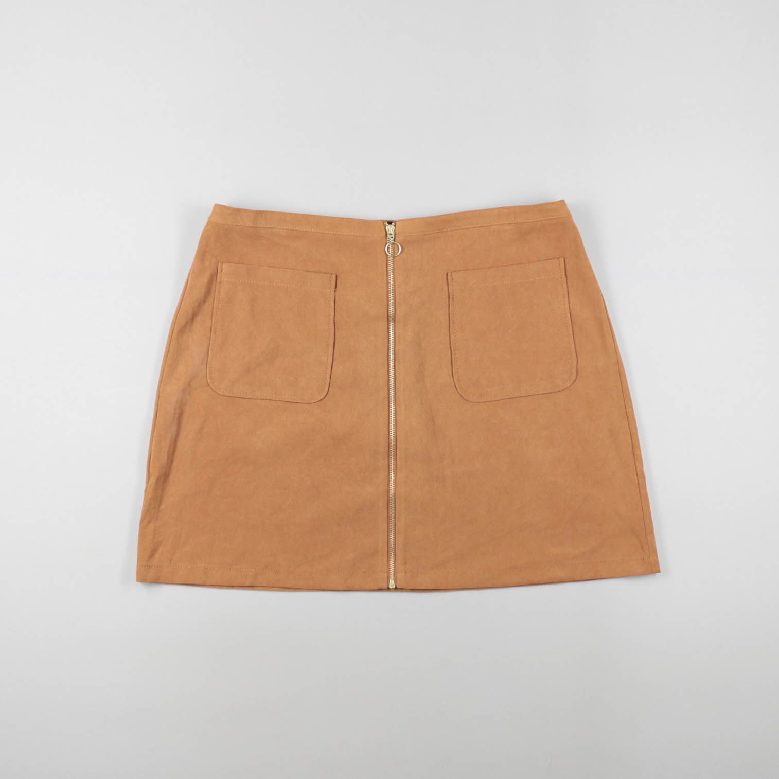 Юбка мини из материала под замшу в тёплом коричневом оттенке, с крупными накладными карманами и центральной молнией спереди. Подойдёт для повседневных образов с свитером, рубашкой или футболкой в прохладную погоду. Молния спереди позволяет удобно надев...