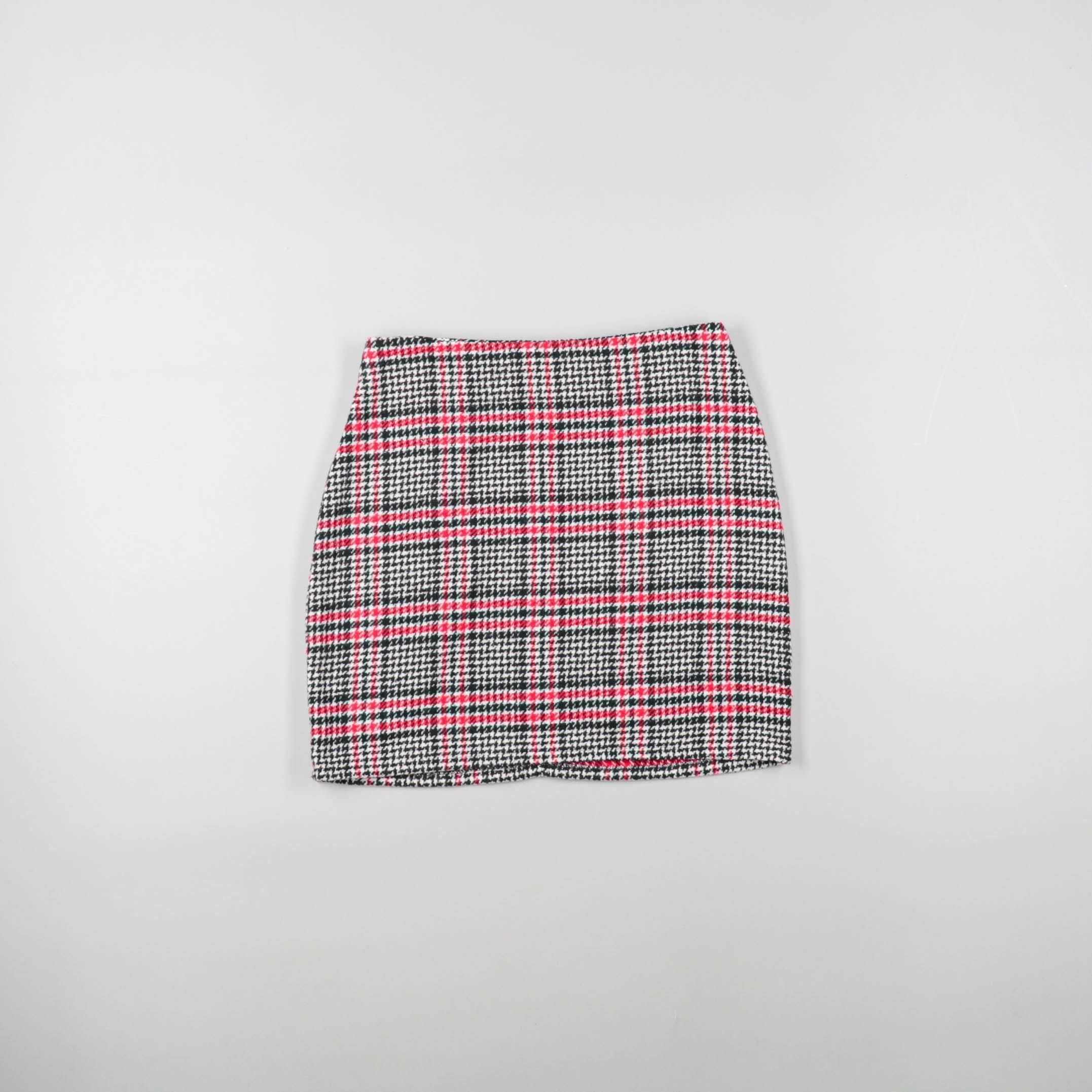 Юбка в клетку (чёрно-белая «гусиная лапка» с красными линиями), облегающего мини-кроя. Подойдёт для повседневных и офисных образов с однотонным верхом и ботильонами/кедами. Плотная ткань держит форму и не требует сложного ухода.