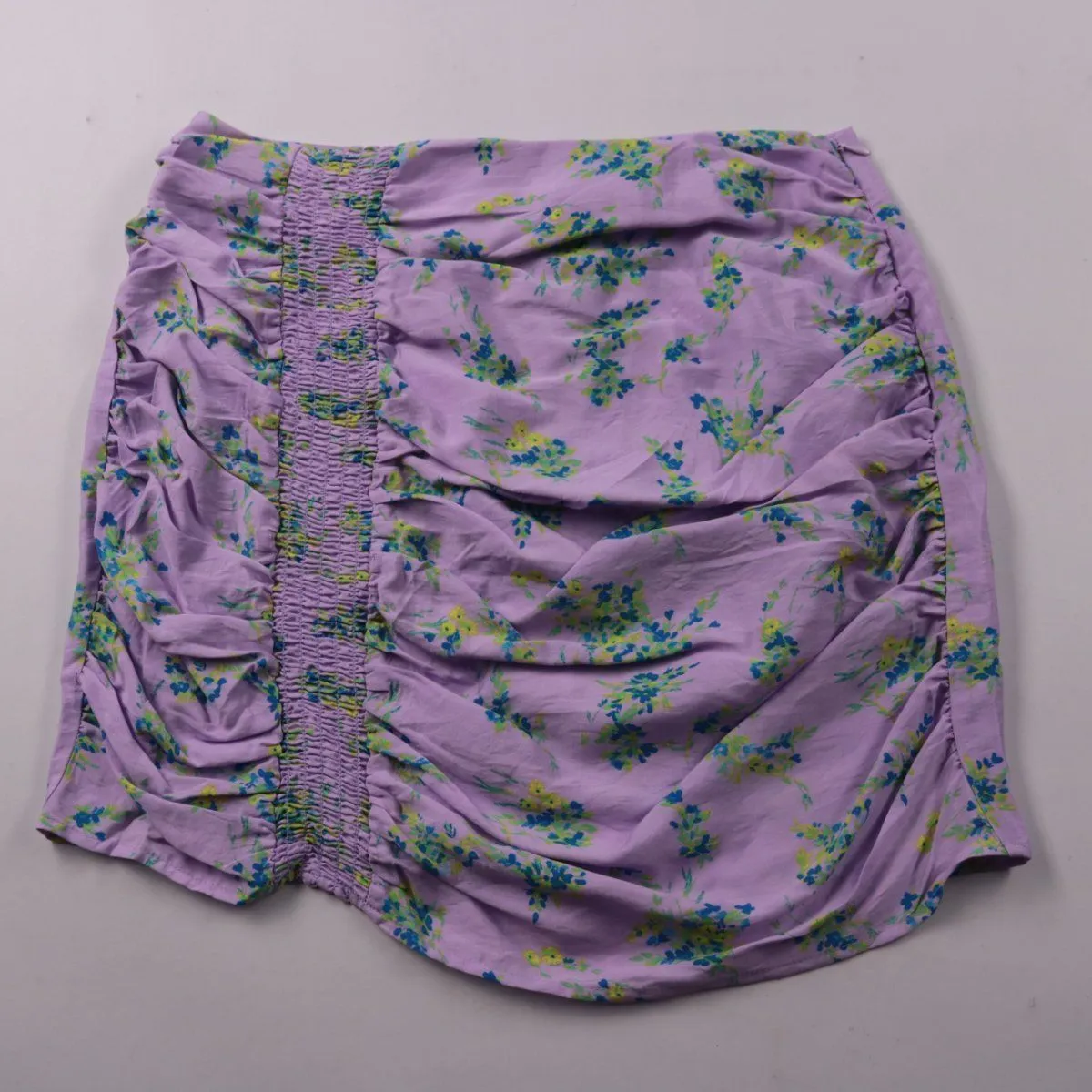 Мини-юбка Vero Moda с цветочным принтом на лиловом фоне и декоративной сборкой сбоку. Подойдёт для летних прогулок и отпускных образов с топами и сандалиями. За счёт мягкой вискозы и присборенных деталей комфортно садится и не сковывает движения.
